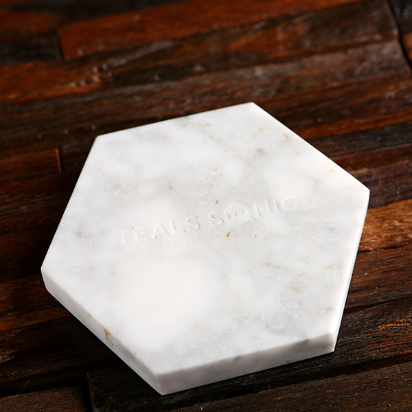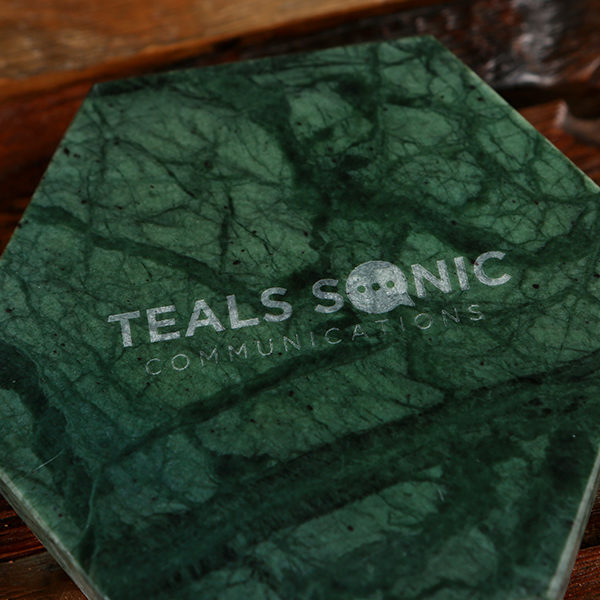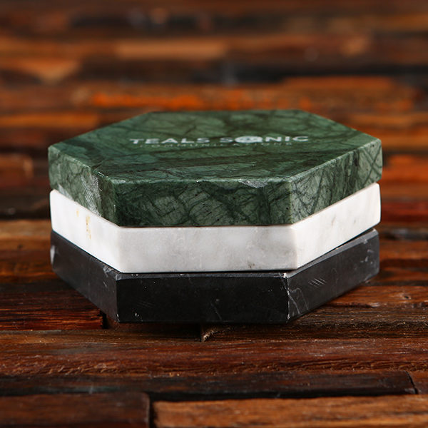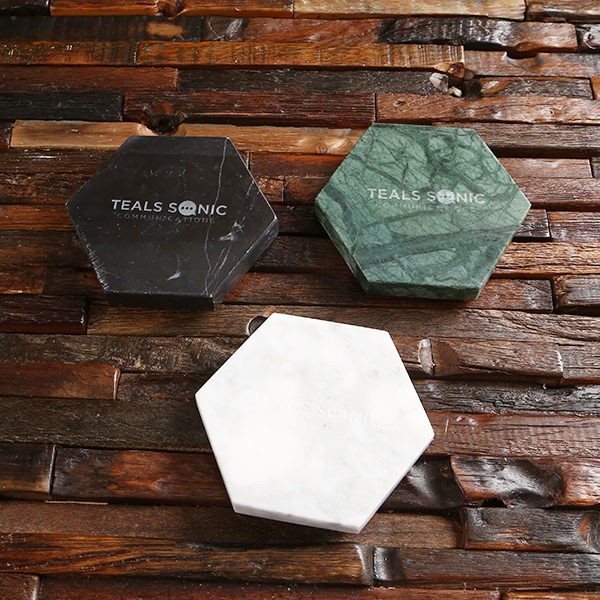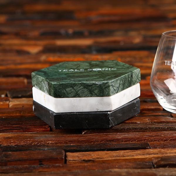 Make an exceptional gift or gift set with these hexagonal marble coasters. Each one features a unique texture and showcases your corporate logo or custom design. Available in white, black, or green marble. They’re great for employees, coworkers, and clients. Let us know how we can make these great for your team. Comes as a set of three coasters.