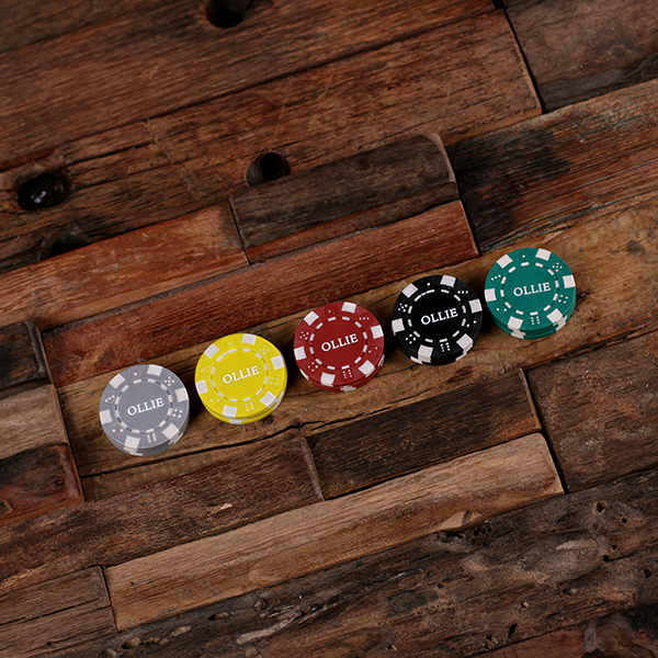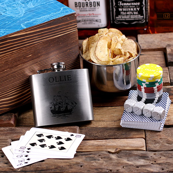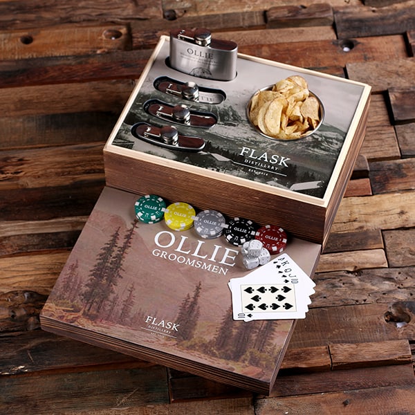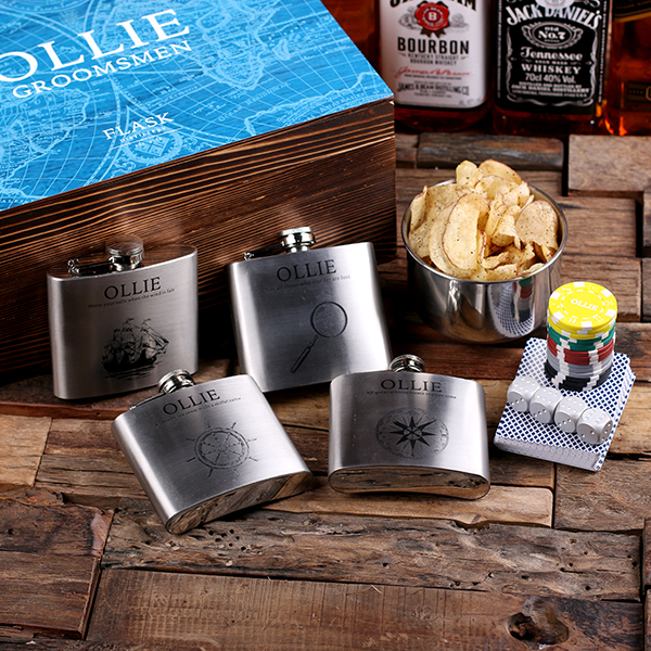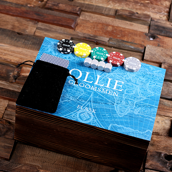 • The flasks and keepsake wood gift box feature unique designs that we can personalize for you with a name and text. Even the poker chips will be personalized with your recipient’s name, initials, or a design. The artwork is permanently engraved on the flasks and printed on the keepsake wood gift boxes.