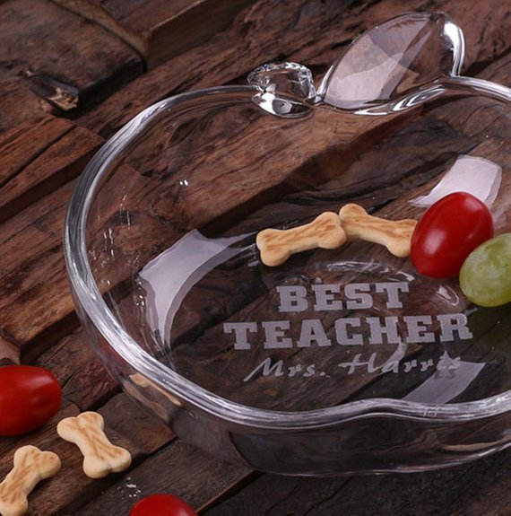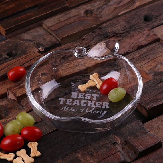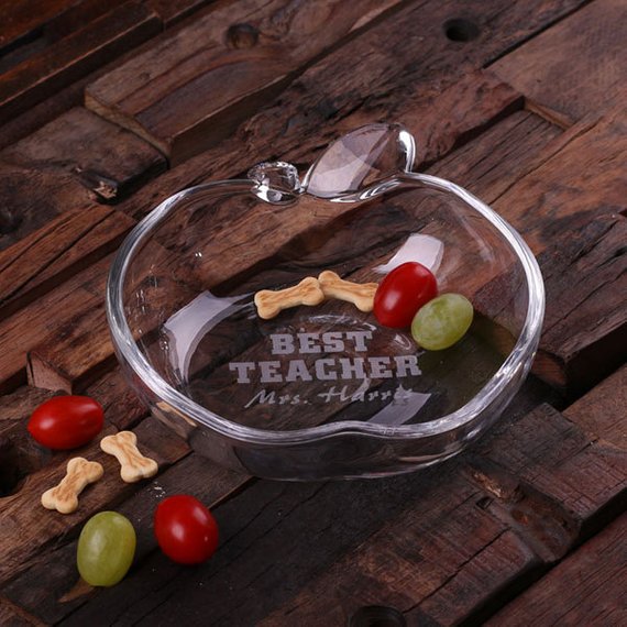 This cute apple shaped dish is a lasting reminder to your favorite educator that you appreciate them. Personalize this apple-shaped glass bowl with a name or special message. It is perfect for serving snacks or holding small office items and it makes a wonderful accent for any table or desk.