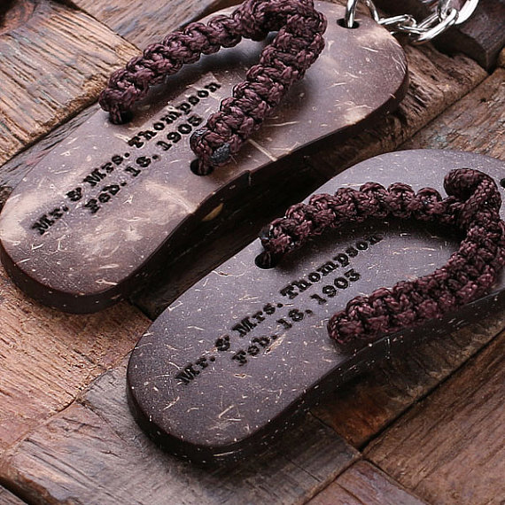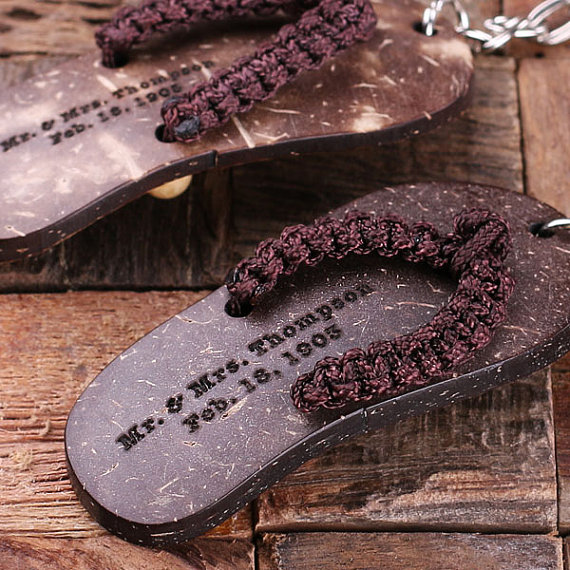 Our personalized coconut shell flip-flop keychain is the perfect way to celebrate a special trip or a destination wedding. Each one is truly an original party favor that your guests are sure to enjoy and use for years to come. Personalize the authentic coconut shell flip flop with a name, a date, and information about your special event. Your recipient is sure to enjoy this unique gift.