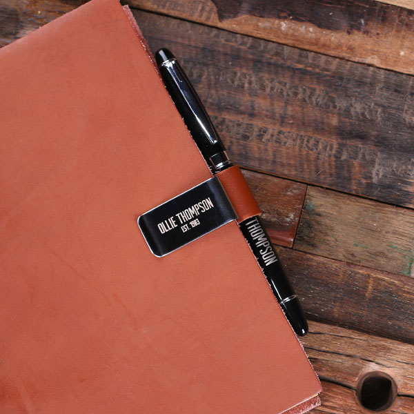 This personalized pen and pen holder set for notebooks and diaries keeps all your items together in a convenient way. It works on a variety of books and notepads, so that you always have a writing utensil on hand. We can personalize it with text, a design, or monogram, so let us know how we can make this a special gift for you or your recipient.
